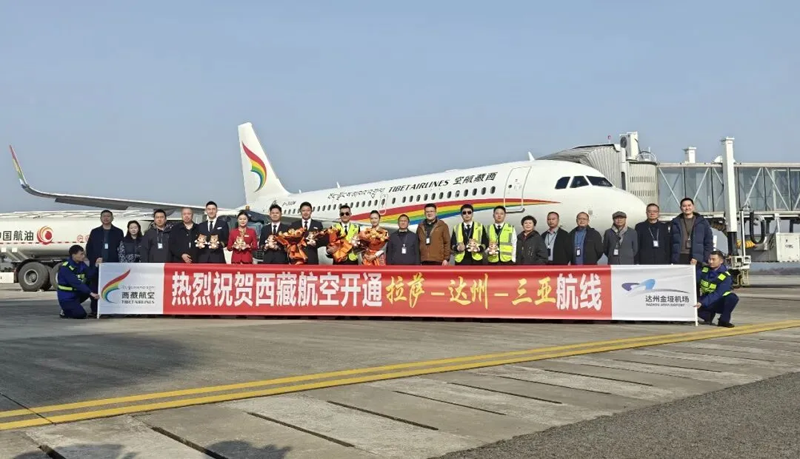 近日,拉萨=达州=三亚航线在达州金垭机场成功首航。达州市交通运输局、达州市财政局、达州市旅游协会及旅行社代表共同参与首航仪式,庆祝航线正式开通。(省机场集团)