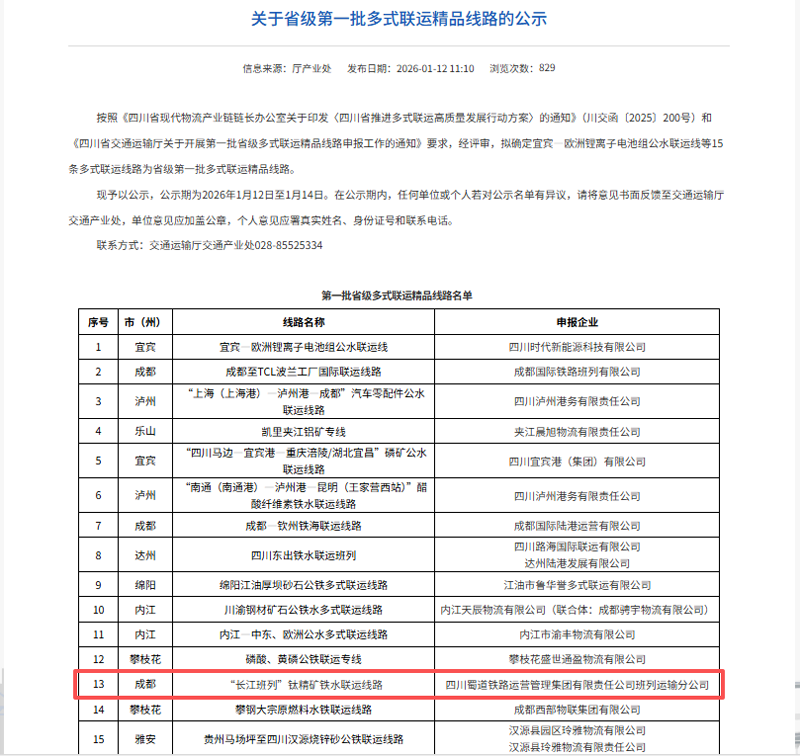 近日,四川省交通运输厅公示省级首批多式联运精品线路名单,拟确定15条多式联运线路为省级第一批多式联运精品线路。蜀道铁路运营集团“长江班列”钛精矿铁水联运线路成功入选。(蜀道集团)