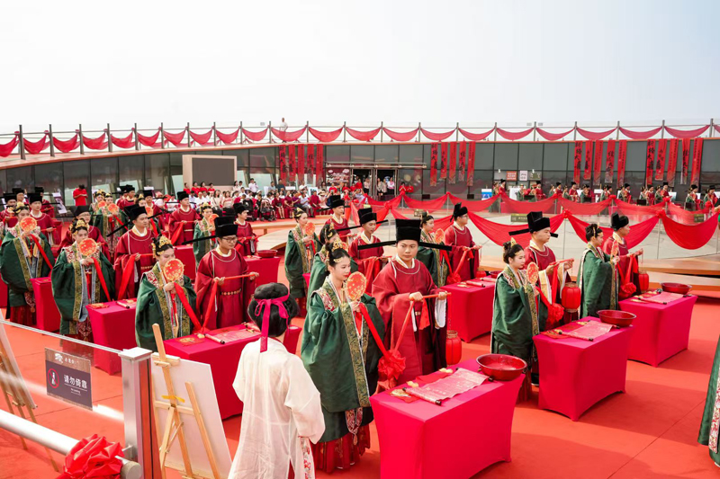 蜀山有情,鸾凤和鸣。仪式现场,新人们身着典雅宋制婚服,在传统鼓乐与司仪吟诵中,跨过象征红红火火的火盆,行过寓意相连的鹊桥,完成庄重的“三拜”之礼。随后盥洗、合卺、结发、执手……一系列古韵十足的仪式,在巍峨的“城市之眼”映照下,将个人的幸福时刻,升华为一场穿越千年的文化见证,为新人刻下了终身难忘的浪漫记忆。