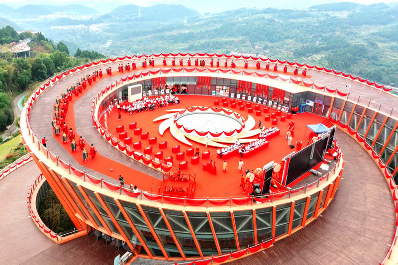天地为凭,山河为证;丹景双影,连理喜成。10月10日,成都“城市之眼”龙泉山丹景台红锦盈地,鼓乐喧天。10时许,当阳光熨过龙泉山脉,将丹景台的“太阳神鸟”镀成金红,新人们身着宋制婚服,踏着优美的国风音乐,缓缓走过红色鹊桥,中铁二局“天工谱鸾凤 良缘荟中铁”2025年职工集体婚礼在此浪漫启幕。来自施工一线的38对职工新人,在父母、领导及同事的见证下,携手迈入婚姻殿堂,以龙泉为媒,许下一生诺言。