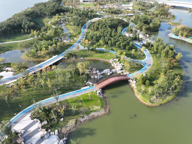 中央绿谷位于雄安新区启动区,占地面积达49.5公顷,是串联启动区建筑群的核心蓝绿生态骨架。项目主要施工内容包括仿古建筑2座、景观桥梁8座、滚水坝9座、特色节点10座、主园路及铺装路9.5千米,水系22万平方米。