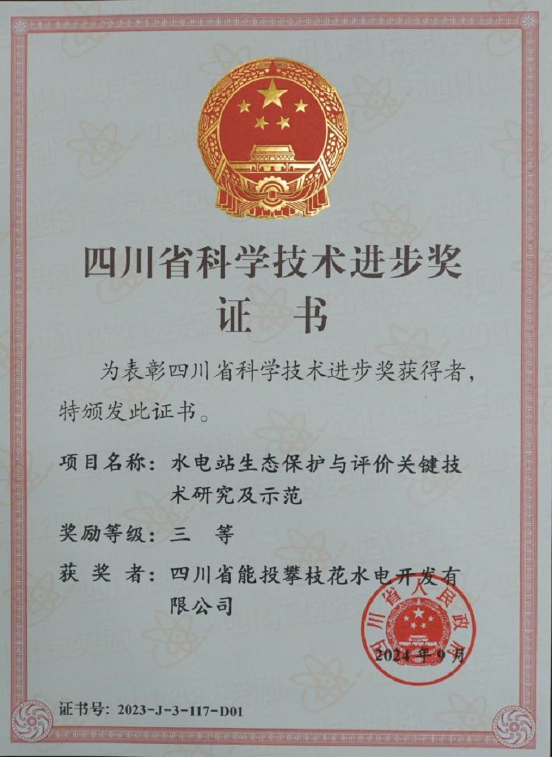 近年来,四川能投集团秉持“绿色低碳、科技赋能”企业宗旨,大力培育发展新质生产力,加快信息技术、人工智能、生物医药、新能源、新材料等领域科技创新,推动产业高端化、智能化、绿色化发展。四川能投攀枝花公司积极响应四川能投集团科技创新工作部署和要求,依托金沙电站自然资源优势,联合四川省水利科学研究院、长江勘测规划设计研究有限责任公司等单位成立科研攻关课题组,开展“水电站生态保护与评价关键技术研究及示范推广”课题研究。课题研究历时8年,形成国家发明专利6项、实用新型专利10项,公开发表学术论文25篇,其中SCI论文9篇。该项目成果已在金沙、银江水电站等工程中广泛应用,产生直接经济效益达27亿元,为水电站水生态保护、鱼道建设、生态调度及管理决策等提供了科学依据,为推进我省及长江中上游水电站生态保护发挥了积极作用。