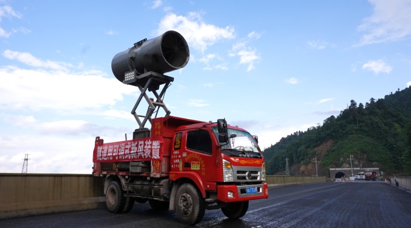 面对隧道沥青施工温度高、通风差、能见度低等问题,项目团队自主研发了隧道沥青路面施工移动式通风系统,在原有风机系统基础上,增加车载式风机,实现动态移动通风,有效增加隧道内通风量,同时实现通风照明一体化,优化沥青路面隧道作业条件,保障隧道沥青路面施工环境及现场质量管控积极性。