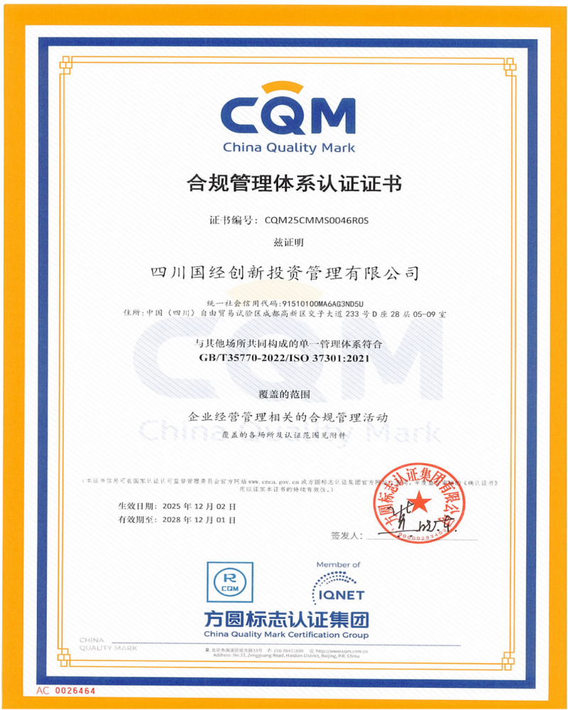 近日,省国经公司所属四川国经创新投资管理有限公司(简称“国经创投公司”)成功通过ISO37301:2021国际标准与GB/T35770-2022国内标准合规管理体系认证,获得双标准认证证书。这标志着省国经公司“上下联动、协同发展”的合规管理体系建设取得新成效,国经创投公司合规管理工作迈入规范化、标准化新阶段。