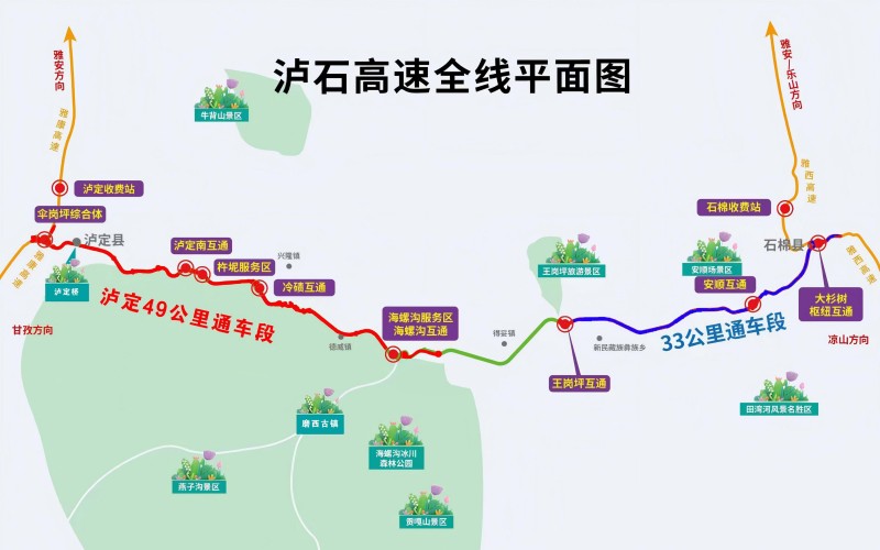 12月30日12时,由蜀道集团(藏高公司投资,公路设计院公司设计,四川路桥建设)投资建设的泸石高速泸定段(伞岗坪互通至海螺沟互通)49公里建成,其中45.61公里投入试运行,标志着成都至海螺沟实现全程高速公路直达,预计可有效分流原省道80%以上的车流量,显著缓解川西旅游黄金线路的交通拥堵压力。