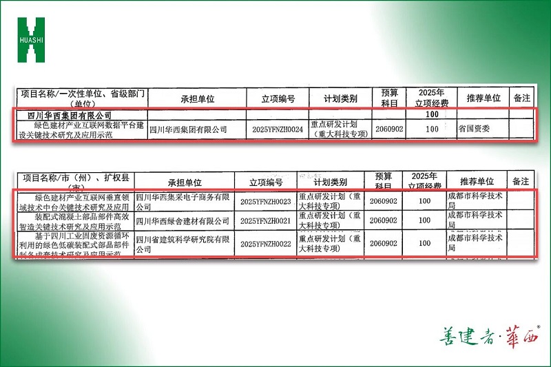 近日,科技创新战线传来捷报——华西集团牵头申报的四项重大科技专项项目,在四川省2025年重点产业链科技攻关项目中成功获批立项,项目专项资金规模1200万元,其中财政资助400万元。这是四川省“15+N”产业链建圈强链工作中首批落地的重点科技攻关项目,充分体现省政府对华西集团担当全省绿色建材产业“链主”的实力认可。