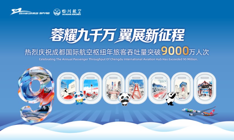 2025年12月31日,成都国际航空枢纽年旅客吞吐量正式突破9000万人次,再创历史新高。四川航空(以下简称“川航”)在双流机场T1举办主题产品发布会及系列活动,带来职业制服秀、童趣节目表演,以及中转服务、快线产品、研学产品、宠物机票等特色服务产品推介,与广大旅客共同庆祝这一里程碑时刻。