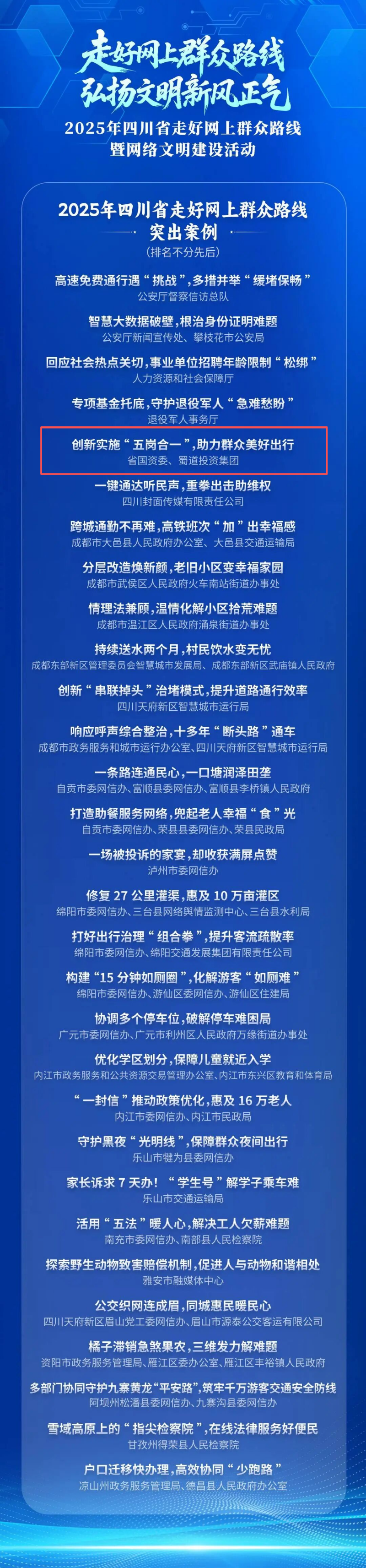 近日,四川省走好网上群众路线暨网络文明建设活动在眉山圆满落幕,由省国资委和蜀道集团推荐的案例“创新实施五岗合一,助力群众美好出行”脱颖而出,获评“2025年四川省走好网上群众路线突出案例”,并接受现场表彰。