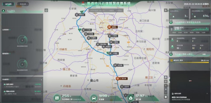 在成仁高速成都收费站公里外的“智慧云仓”控制中心,巨型电子屏实时跳动路网数据。这里不仅是数据汇聚的“大脑”,更是应急处置的“指挥塔”,一旦监测到车辆事故、ETC交易失败、设备故障等异常,系统立即自动预警并生成工单智能派发,事故信息同步秒推交警、路产管护等部门,救援力量据此就近调度,实现“发现即响应”的高效联动。针对车道超时滞留车辆,云仓依托算法精准感知,自动生成分级工单:滞留1分钟触发黄色预警,3分钟升级为红色警报,云控员随即按等级主动远程介入,可远程完成抬杆放行、修改计费信息等操作,全程无需人工跑动。这一“智能感知—分级预警—远程处置”闭环,既避免了车道拥堵加剧,更让驾乘人员在无形中感受到畅通通行的便捷,有效提升了通行体验。