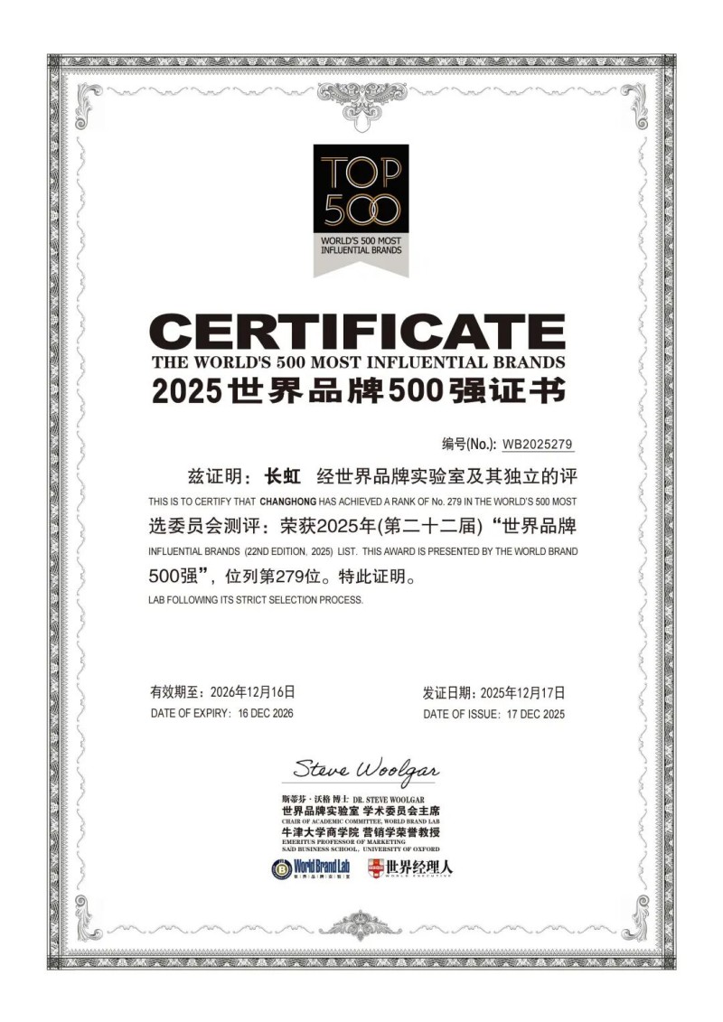 12月17日,世界品牌实验室(World Brand Lab)揭晓了2025年度(第二十二届)《世界品牌500强》榜单,中国上榜品牌数量达50个,稳居全球第三。其中,长虹位列第279位,较2024年上升4位。