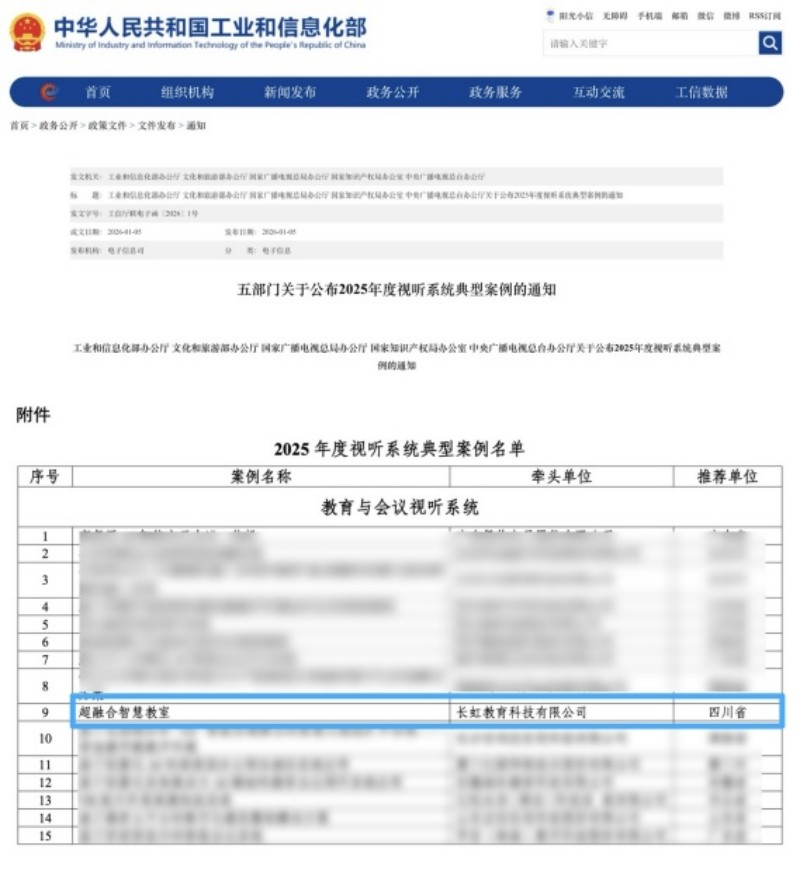 1月6日,工业和信息化部、文化和旅游部、国家广播电视总局、国家知识产权局及中央广播电视总台五部门联合公布了“2025年度视听系统典型案例”名单。四川长虹教育科技有限公司(以下简称“长虹教育科技”)打造的“超融合智慧教室”解决方案成功入选“教育视听系统”类别典型案例。