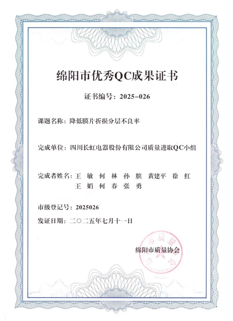 2025年度,长虹控股集团继续深入开展各类质量控制(Quality Control,以下简称QC)改进与创新活动,聚焦生产瓶颈攻克、质量提升、废损降低、效率优化等重点领域,以小切口破解大难题,推动质量改进工作走深走实、见行见效。