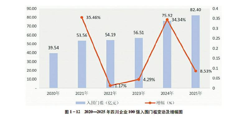 2020年川企100强入围门槛(上一年企业营收数据)为39.54亿元,2021年为53.56亿元,到了2025年,入围门槛为82.40亿元。5年时间,川企100强入围门槛已提高近30亿元,除此之外,川企头部阵营发生了哪些变化?哪些企业勇立潮头?背后又折射出怎样的发展趋势?