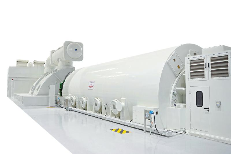 在燃气机组所在主厂房内,两个巨大的白色罩壳颇具科幻感。机组运行时,空气经压气机压缩后与天然气混合燃烧,产生的动能推动发电机发电,其氮氧化物、二氧化硫等排放浓度远低于国家超低排放标准。