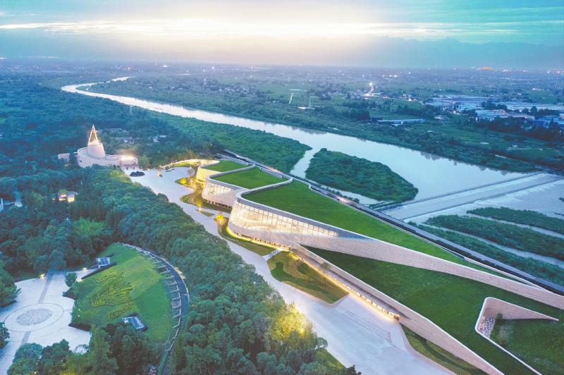 2023年7月,四川德阳,新落成的三星堆博物馆新馆形如3个微微隆起的覆土堆体,静静躺在成都平原上。
