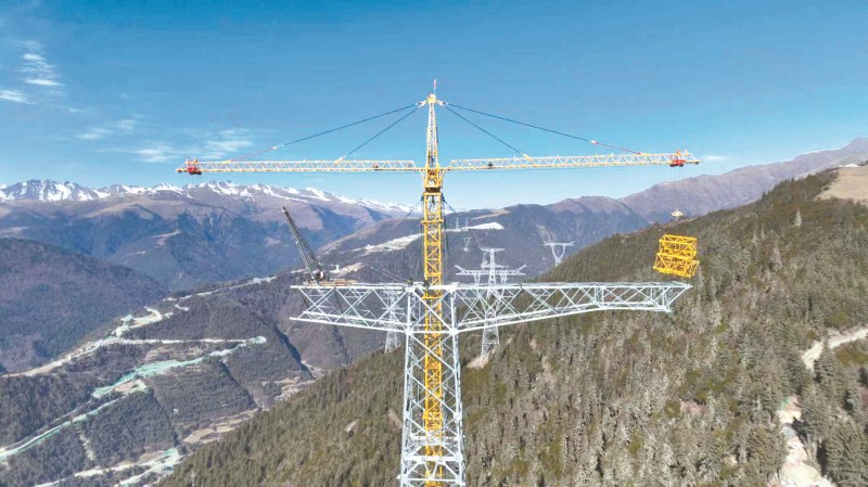 在阿坝—成都东1000千伏特高压交流输变电工程1标段现场,作业人员开展组塔作业。谢春艳 摄