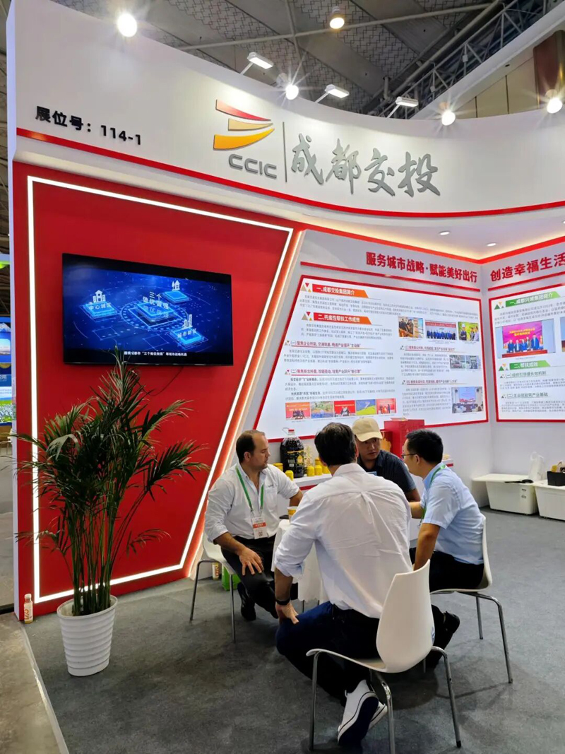 甘孜州新龙县梁茹林卡公司负责人在成都交投集团农博会展台与外商洽谈合作