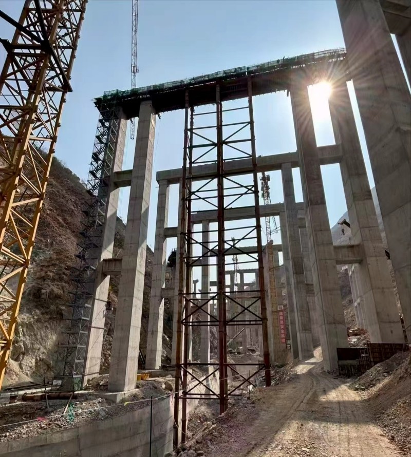 为攻克盖梁支架搭设难题,施工团队用上了一项专利工法——“桩基础+钢立柱+工字钢组合支架”专利施工工法。先在地下打下牢固的钢筋混凝土桩,就像大树扎根;然后在桩基上逐段安装粗壮的钢管立柱,再用工字钢横向连接,形成一个结实的空间框架;最后在顶部架上承重梁,整体组成一个扎实的“空中工作台”。这种做法能把千吨重量稳稳传到地下深处,避免大量开挖山体,也保护了桥墩不受损伤,既安全又精准,为高空架设这道千吨“巨梁”撑起了保险的平台。