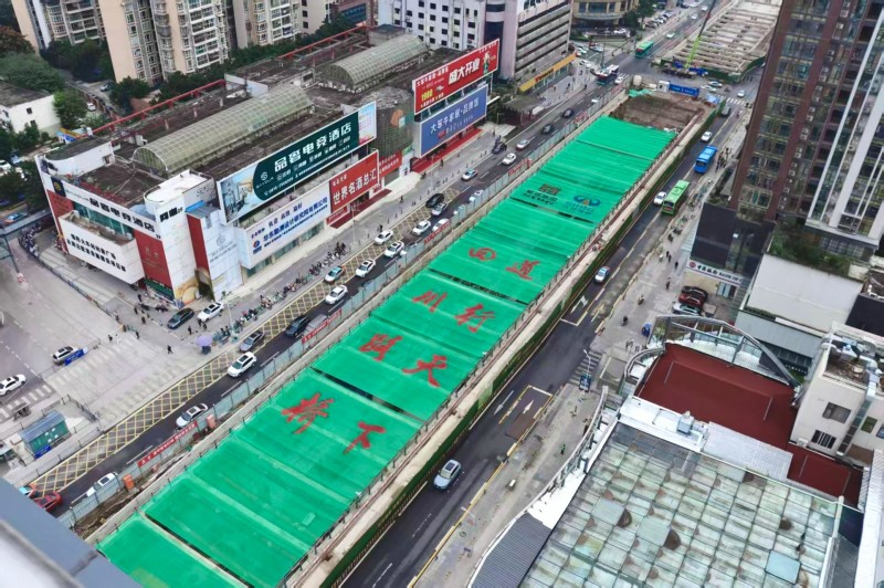 临园路下穿隧道项目施工环境复杂、建设要求高,直面三重刚性约束——上方是密集的火车站运营线路,两侧是流量密集的城市主干道,地下是纵横交错的管线网络。项目施工必须在“零干扰、零中断、零事故”的前提下推进。为此,项目团队依托BIM技术开展施工模拟,通过三维建模优化支护方案,将基坑变形控制在25毫米内,并建立模板支撑受力模型,保障混凝土浇筑精度;架设4480平方米智能防尘天幕,根据作业需求与天气情况实现一键开合,变传统被动防尘为主动降尘,扬尘浓度降低82%;采用“泡沫混凝土原位回填”工艺,以轻质材料填充废弃管道,化解地下废弃管线与桩基冲突的难题,为管线结构提供稳定支撑。