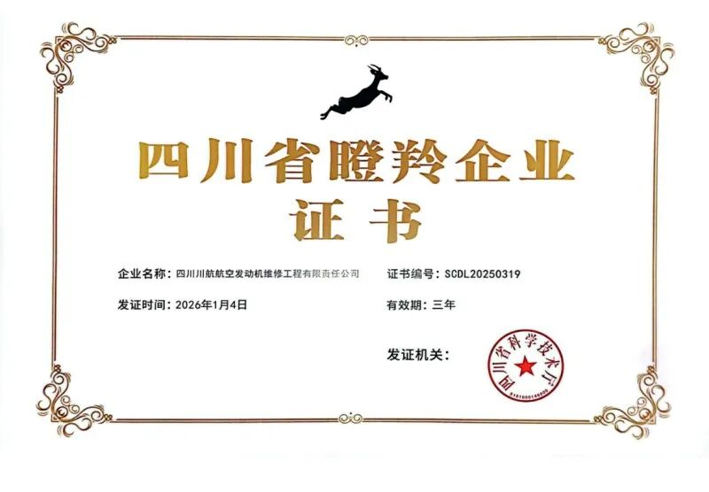 近日,川航集团下属的四川川航航空发动机维修工程有限责任公司荣获四川省科学技术厅颁发的“四川省瞪羚企业”资质证书,标志着川航航发正式跻身高成长性科技型企业梯队。(川航集团)