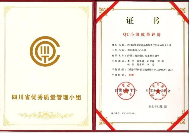 近日,2025年省级优秀质量管理小组成果名单公布,九寨黄龙机场高原雄鹰QC小组《降低目视助航灯光光源失效率》课题荣获四川省质量管理小组二等成果。(省机场集团)