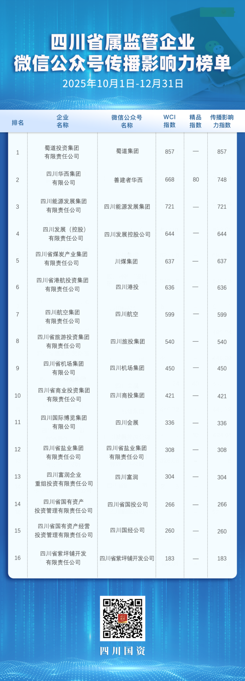 为充分发挥矩阵力量,凝聚联动宣传合力,进一步提升四川省国资系统微信公众号传播力和影响力,省国资委在四川省属国有企业开展微信公众号传播影响力综合评价,并发布“四川省属国有企业微信公众号传播影响力榜单”。本期发布2025年四季度榜单。
