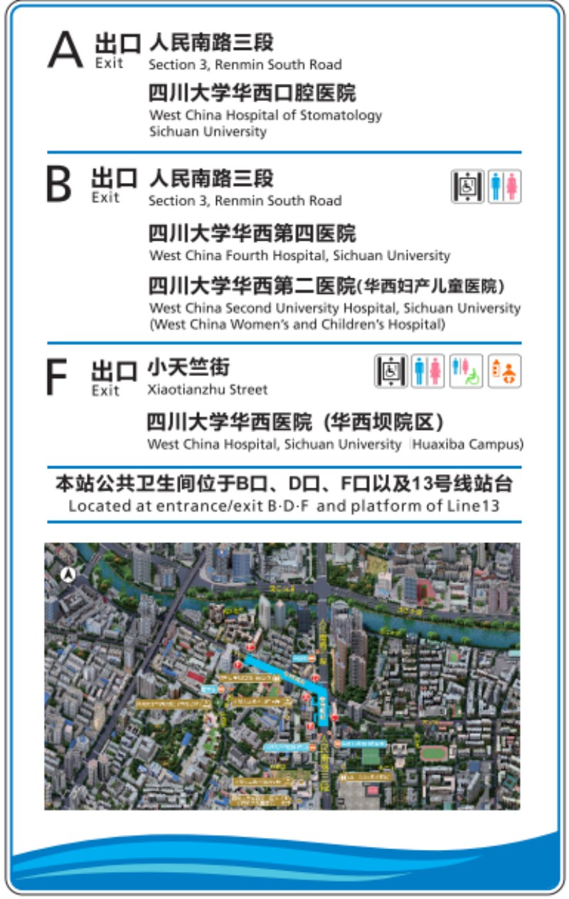 华西坝站导向标识清晰标注不同出口对应医院信息