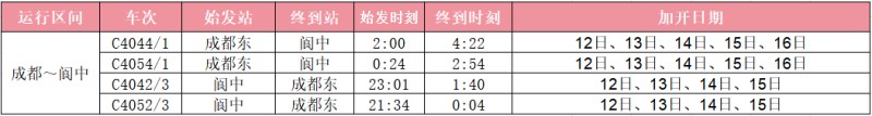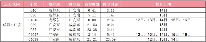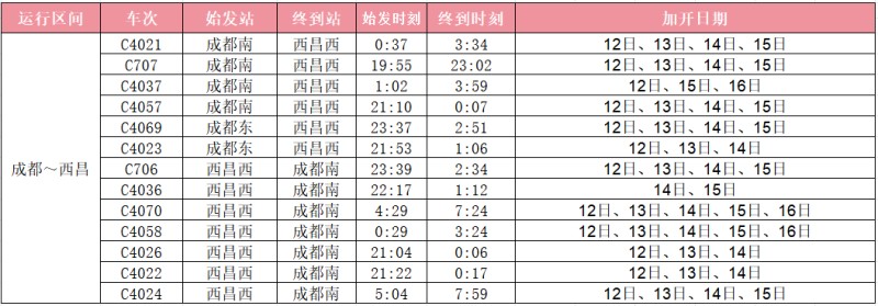 针对春运高峰期的出行保障,成都局集团公司客运部相关负责人表示,将在春运高峰期大力加开华南、华东、西安等方向夜间动车,并对达成、郑渝等高候补区段进行运能补充,进一步满足春节前旅客出行需要。