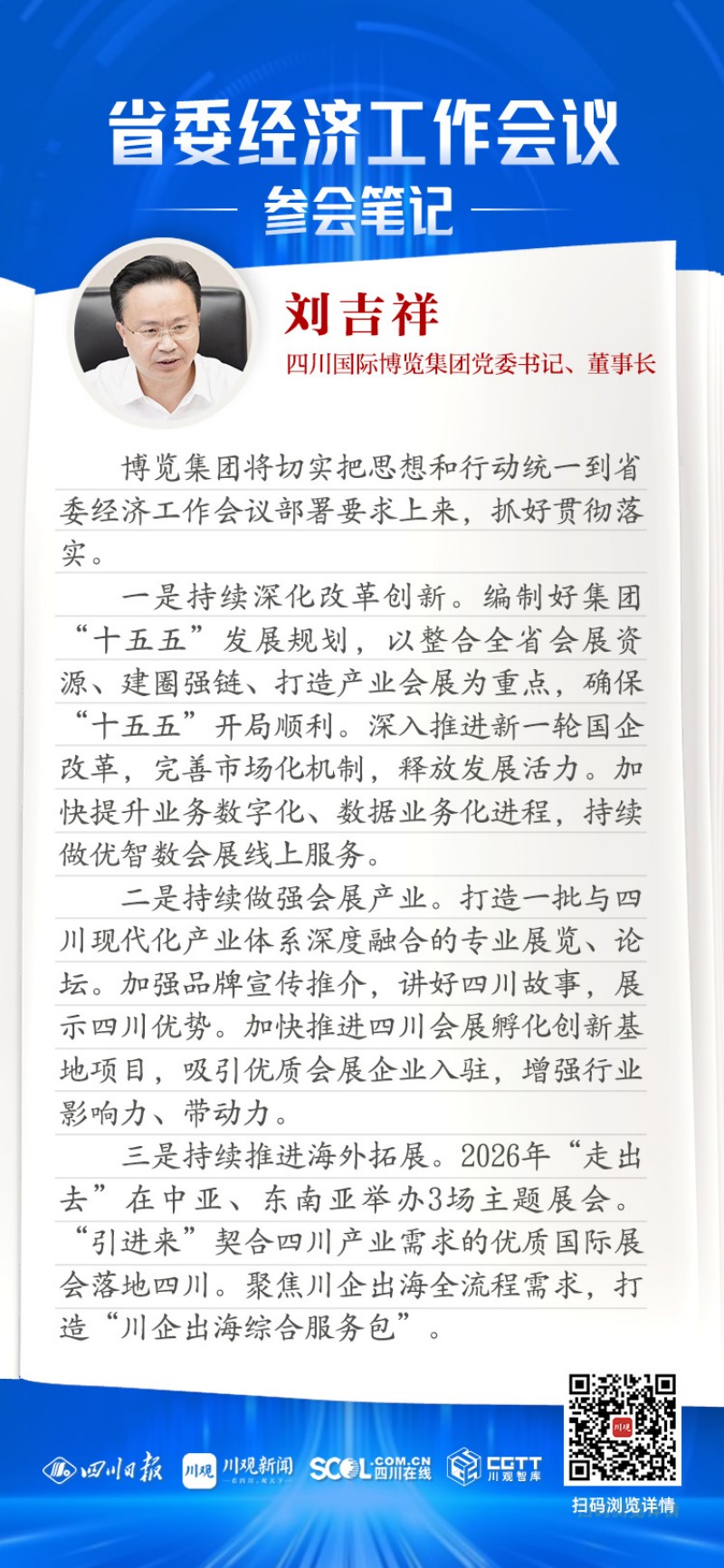 三是持续推进海外拓展。2026年“走出去”在中亚、东南亚举办3场主题展会。“引进来”契合四川产业需求的优质国际展会落地四川。聚焦川企出海全流程需求,打造“川企出海综合服务包”。