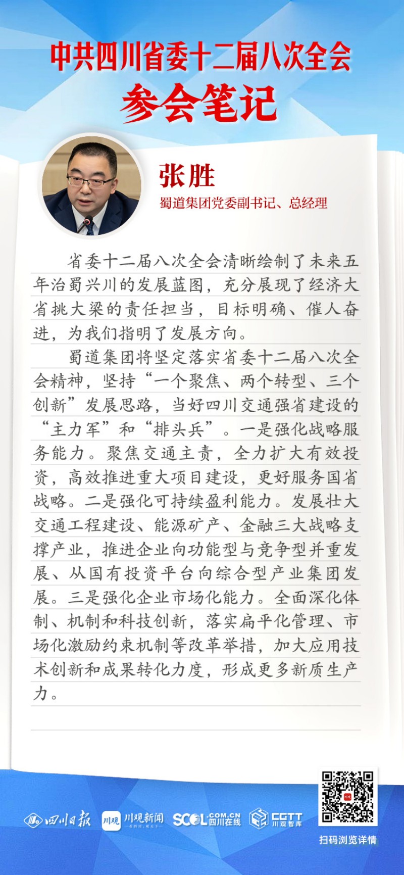 蜀道集团将坚定落实省委十二届八次全会精神,坚持“一个聚焦、两个转型、三个创新”发展思路,当好四川交通强省建设的“主力军”和“排头兵”。一是强化战略服务能力。聚焦交通主责,全力扩大有效投资,高效推进重大项目建设,更好服务国省战略。二是强化可持续盈利能力。发展壮大交通工程建设、能源矿产、金融三大战略支撑产业,推进企业向功能型与竞争型并重发展、从国有投资平台向综合型产业集团发展。三是强化企业市场化能力。全面深化体制、机制和科技创新,落实扁平化管理、市场化激励约束机制等改革举措,加大应用技术创新和成果转化力度,形成更多新质生产力。