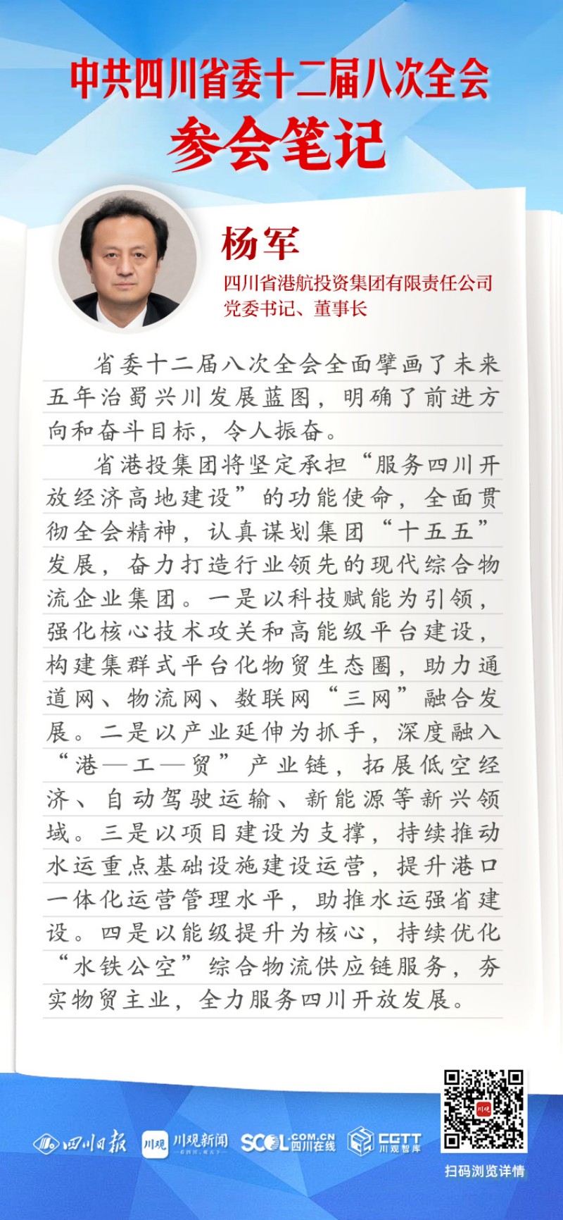 省港投集团将坚定承担“服务四川开放经济高地建设”的功能使命,全面贯彻全会精神,认真谋划集团“十五五”发展,奋力打造行业领先的现代综合物流企业集团。一是以科技赋能为引领,强化核心技术攻关和高能级平台建设,构建集群式平台化物贸生态圈,助力通道网、物流网、数联网“三网”融合发展。二是以产业延伸为抓手,深度融入“港—工—贸”产业链,拓展低空经济、自动驾驶运输、新能源等新兴领域。三是以项目建设为支撑,持续推动水运重点基础设施建设运营,提升港口一体化运营管理水平,助推水运强省建设。四是以能级提升为核心,持续优化“水铁公空”综合物流供应链服务,夯实物贸主业,全力服务四川开放发展。