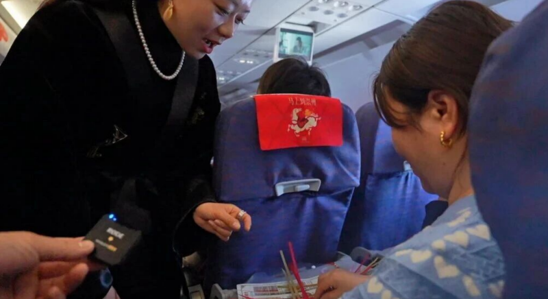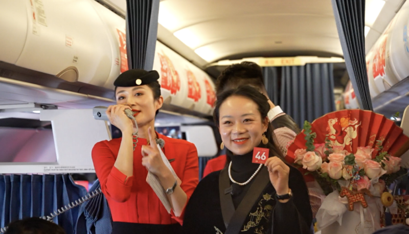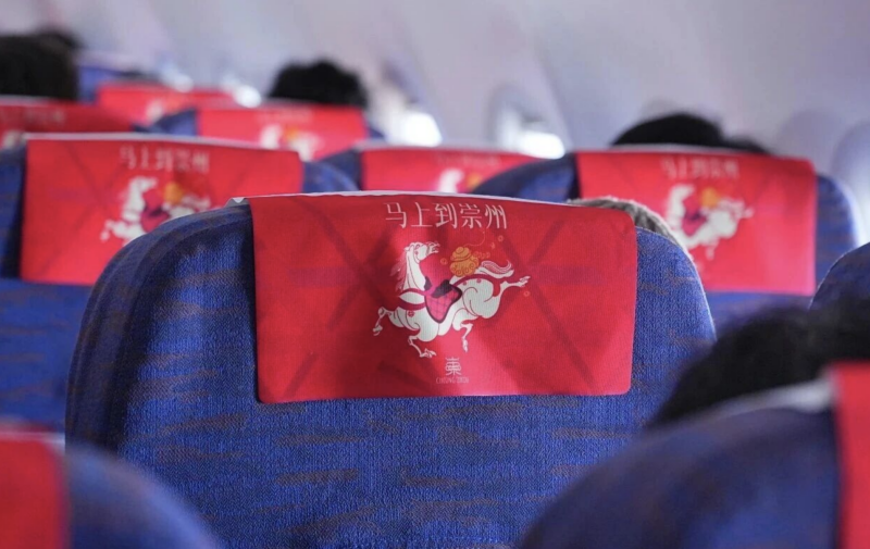 登机时,每位旅客都收到一份非遗伴手礼:内含竹编体验材料包、罨画池门票、华阳国志馆门票、陆游书签、崇州民宿打折券等12种不同领域的礼品。机组人员也为旅客送上春联、福字,与旅客共祈马年大吉、马到成功,瞬间营造出浓浓年味与非遗文化氛围。
