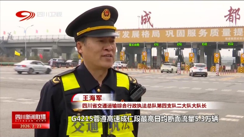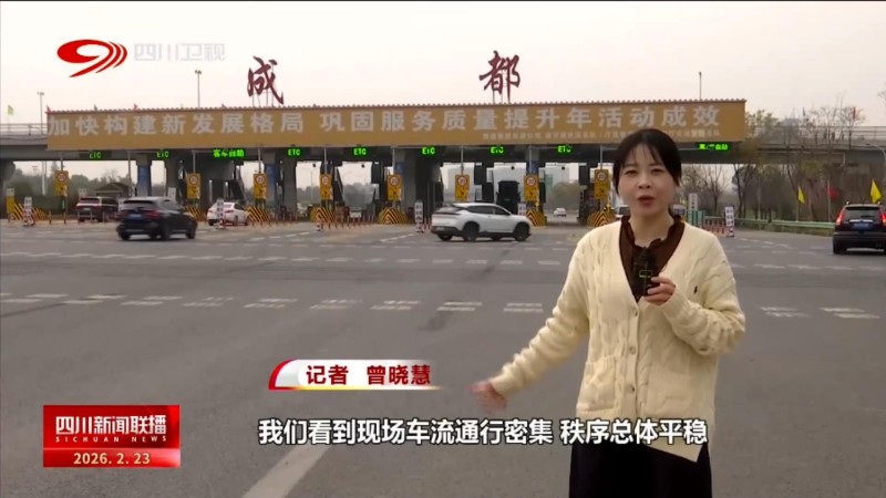 记者 曾晓慧:这里是G4215蓉遵高速成都收费站,随着春节假期进入尾声,返程车流明显增加。我们看到现场车流通行密集,秩序总体平稳,这里的车流量相较平时增长近八成。