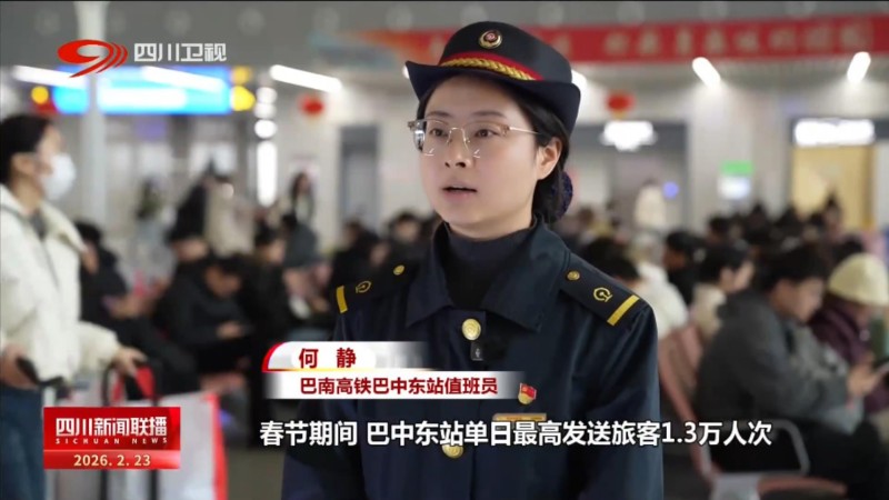 巴南高铁巴中东站值班员 何静:春节期间,巴中东站单日最高发送旅客1.3万人次,较去年同期增长19.15%。短途客流以成都、重庆(方向)为主,增加该方向夜间动车4列。