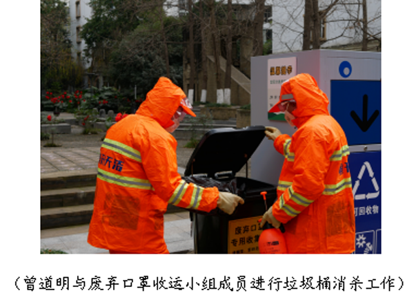 随着新型冠状病毒的扩散,口罩成为了广大居民的生活必需品。曾道明凭借多年工作经验,意识到废弃口罩带有大量的唾液、细菌甚至病毒,已然成为“高危”垃圾。于是他主动向项目提出申请,负责红牌楼项目废弃口罩的消毒、收运工作。经过统一培训,曾道明与公司其他几位工作人员组成废弃口罩收运小组,每天穿梭在项目段面的街道和小区中,负责完成整个区域300多个废弃口罩专用垃圾桶的收运和消杀。环卫雨衣就作为他们保护自己、避免病毒侵袭的武器。
