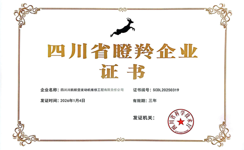 近日,川航集团下属的四川川航航空发动机维修工程有限责任公司荣获四川省科学技术厅颁发的“四川省瞪羚企业”资质证书。此次认定标志着川航航发正式跻身高成长性科技型企业梯队,是对公司创新能力、成长质量和发展潜力的高度认可。(川航集团)