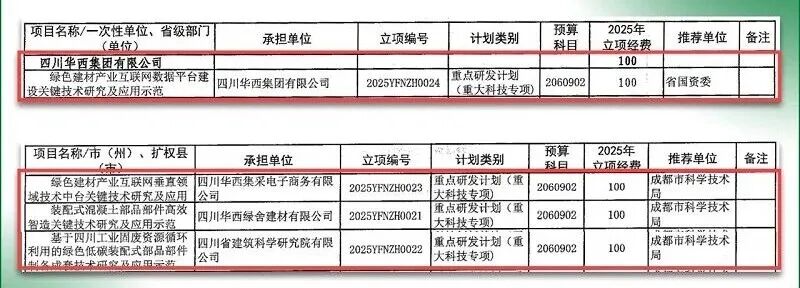 近日,华西集团牵头申报的四项重大科技专项项目,在四川省2025年重点产业链科技攻关项目中成功获批立项,项目专项资金规模1200万元,其中财政资助400万元。(华西集团)