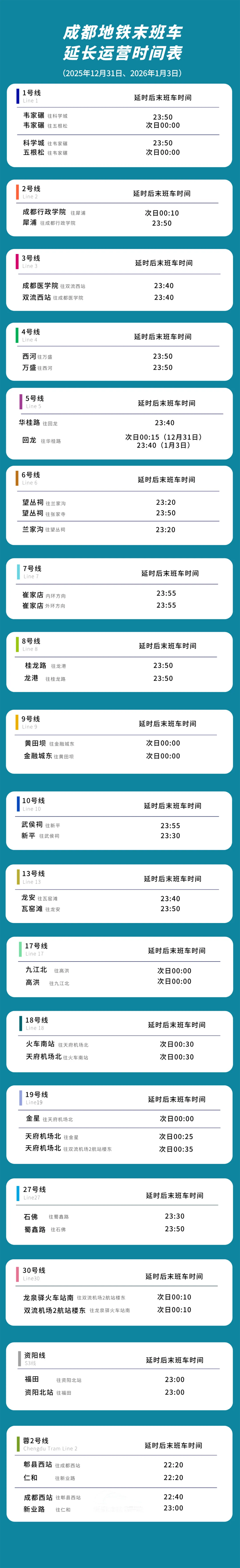 在成都体验完跨年活动后,还有地铁可以带你回家!据成都轨道集团消息,成都地铁将于节前一天(2025年12月31日)以及节日最后一天(2026年1月3日)延长线网各线路运营服务时间,并同步延长地铁服务热线时间。(四川观察)