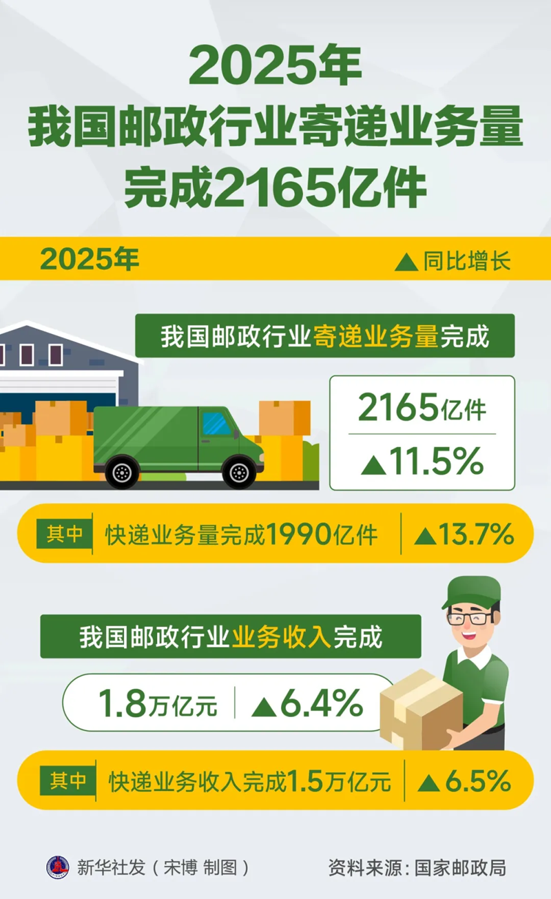 据2026年全国邮政工作会议消息,2025年我国邮政行业业务收入和行业寄递业务量分别完成1.8万亿元和2165亿件,同比分别增长6.4%和11.5%。其中,快递业务收入和快递业务量分别完成1.5万亿元和1990亿件,同比分别增长6.5%和13.7%。(人民网)