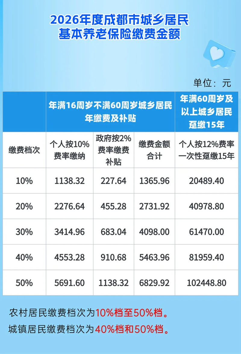 1月8日,2026年成都城乡居民养老保险缴费金额公布∶年满16周岁不满60周岁城乡居民按所选档次缴费后,政府按缴费基数的2%给予缴费补贴,年满60周岁及以上城乡居民一次性趸缴至15年的,不能享受政府缴费补贴。(成都日报)