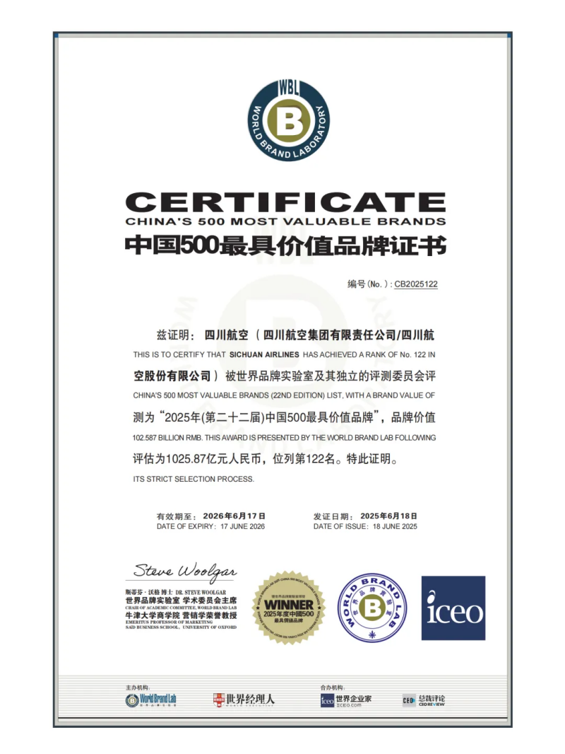 6月18日,第22届世界品牌大会在北京召开,大会发布了2025年度“中国最具价值品牌500强”榜单。四川航空以1025.87亿元品牌价值荣登榜单第122位,较去年提升了12.4%。自2016年参评以来,品牌价值保持了连续十年正增长,并首次突破千亿。