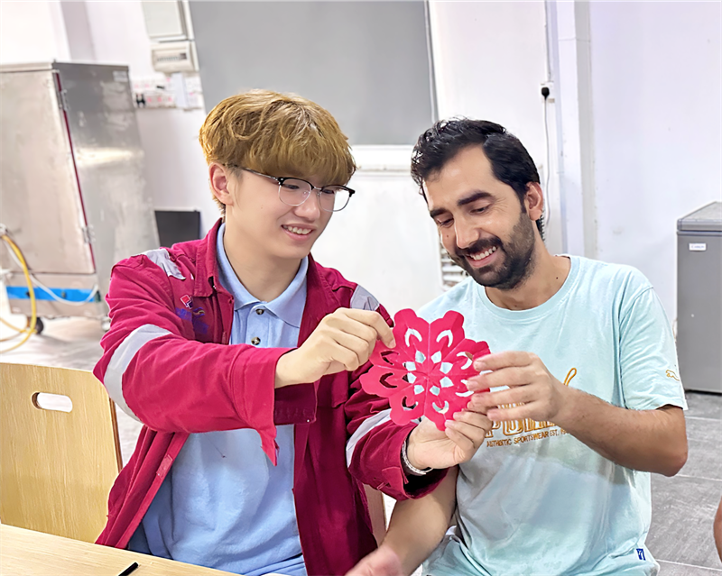 来自四川的安全员陈鑫,正教几位巴籍工友玩着简单的剪纸,一张红纸,几番折叠,剪刀穿梭,展开便是一只栩栩如生的雪花窗花。“Cantik(真漂亮!)”工友们惊叹道,小心翼翼地将窗花贴在宿舍的玻璃上。