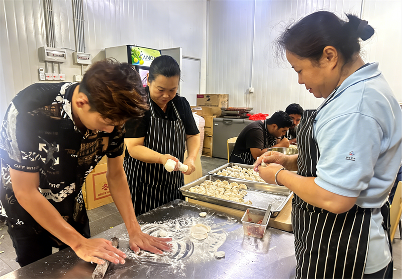 食堂门口,早已挂起了两串大红灯笼,贴上了春联。食堂内,欢声笑语,蒸汽氤氲。中国厨师许姐正麻利地擀着饺子皮,一旁的印尼帮厨学着她的手法,包出的饺子虽形状各异,却满脸兴奋。