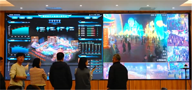 园区入口处,入场的队伍井然有序。这得益于园区应用的智能票务系统,可实现“一键购票、刷脸入园”,让远道而来的游客告别了排长队的烦恼,检票效率大幅提升。走进中华彩灯大世界的指挥中心,一块巨大的监控大屏上,实时显示着园区客流数据、停车场状态、区域人员密度等数据。“目前在园人数14054人,较昨天增长6.3%,6号区域人员密集度达到9,已做好客流引导准备。”中国电信四川自贡分公司云中台副总经理何世宏跟团队成员正紧盯屏幕,关注在园人数变化。作为世界级的旅游目的地,自贡彩灯大世界春节期间预计日客流量达七八万人。为应对春节期间的客流高峰,中国电信提前升级园区网络,将专线带宽提升至2000兆,并实现5G-A网络全园覆盖,加密部署分布式网络设备。园区内,红外计数与摄像头监测双管齐下,实现客流的精准测算,每隔15分钟更新客流数据。当园区人数接近承载上限时,系统会及时预警,工作人员可通过多种方式科学调控,让游园更安全有序。