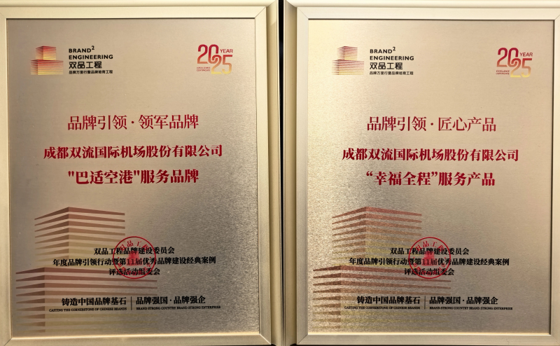 近日,由双品工程建设委员会组织开展的2025年度品牌引领行动暨第11届优秀品牌建设经典案例评选活动在北京圆满落幕。成都双流国际机场携“巴适空港”服务品牌、“幸福全程”服务产品积极参与此次分享交流,并取得两项荣誉:服务品牌“巴适空港”获评“领军品牌奖”“幸福全程”服务产品获评“匠心产品奖”。