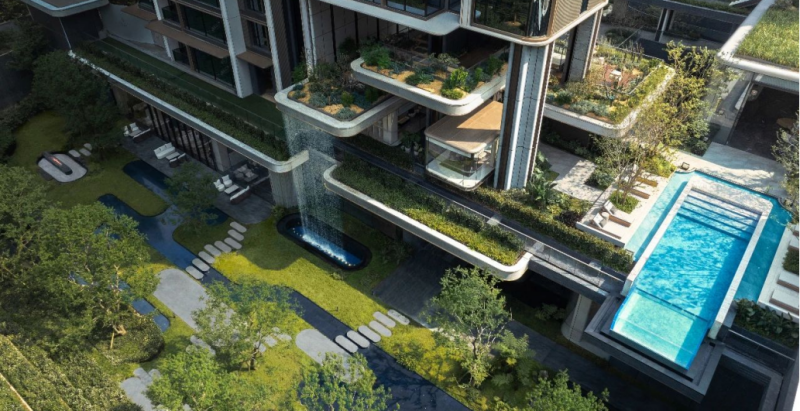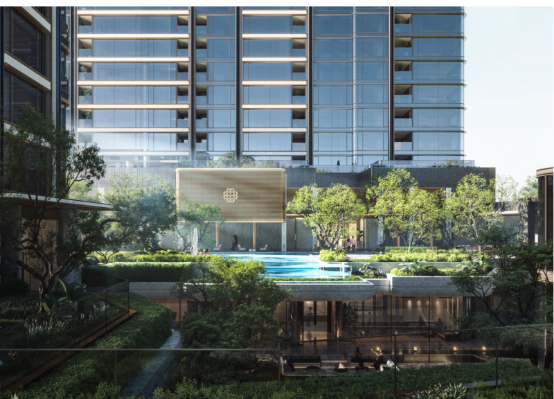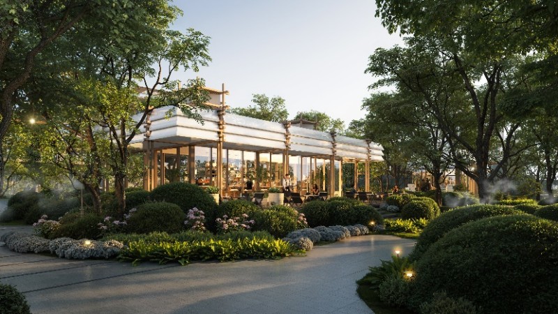 项目以“花园超链体系”为设计主轴,通过外链、内链、私链三重景观连接,构建从城市到房间的沉浸式归家体验。通过林下空间布局商业盒子,联动市政公园形成“元气花园商街”。内设置下沉花园、台地花园、恒温泳池、空中书吧等,形成“全天候全息底盘”式活动空间。