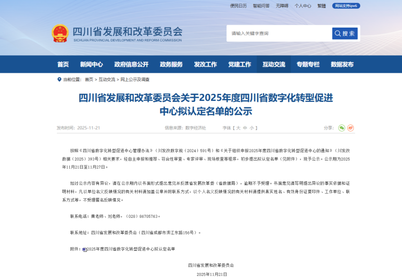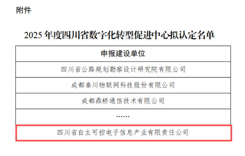 近期,四川省发展改革委员会正式发布《2025年度四川省数字化转型促进中心拟认定名单公示》。经过严格的评审,四川发展(控股)公司旗下四川省自主可控电子信息产业有限责任公司(简称“自主可控公司”或“公司”)成功入选。