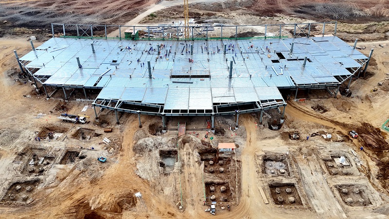项目团队科学统筹施工组织,严格落实安全技术交底,因地制宜推行“清晨作战、午间避峰、夜间突击”的弹性施工制度,全力抢抓施工黄金期。面对物资夜间到港等突发情况,全员主动加班、连夜卸货入库,确保施工进度不受影响。截至目前,航站区累计完成产值2.61亿元,地基与基础工程完成23.8%,中央大厅钢结构安装完成60%,配套道路建设有序推进。一排排基础立柱整齐矗立,一条条施工道路不断延伸,现代化施工阵地初具雏形,项目团队也从最初十余人发展壮大为400余名中外员工协同作战的建设集体,在热带雨林中擦亮中国建造品牌。