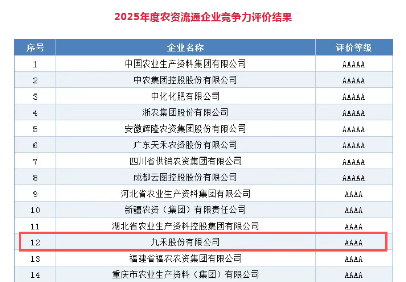 近日,中国农资流通协会发布2025年度农资流通企业竞争力评价和行业知名品牌榜单,泸天化九禾股份有限公司获评2025年度农资流通企业竞争力“AAAA”等级,这也是自2023年以来,公司连续三年获评该等级。旗下“九禾”“工农”“康+”“菜缘快手”“果缘三季”等多个品牌获得“2025年度农资行业知名品牌”认定,实现服务类、产品类“双满贯”。