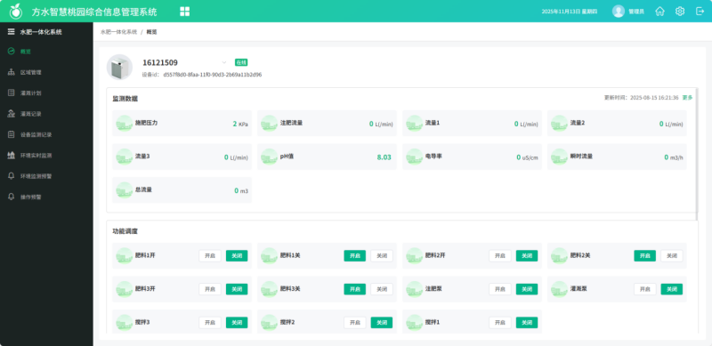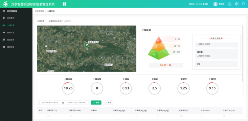 云端“大脑”大数据平台内置“方水蜜桃生长模型”,根据萌芽期、花期、膨果期、成熟期等不同生长期的需水需肥规律,自动生成调整水肥方案,比如膨果期需钾量高,系统会将钾肥比例从15%调整至25%;若监测到土壤湿度低于60%(适宜湿度为60%~70%),则自动触发灌溉指令。